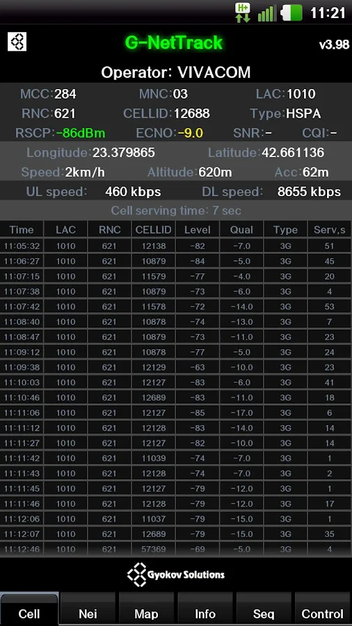 - if you have information about the sites you can create cellfile and you can view sites on map - see the screenshots. Put the file in the folder G-NetTrack_Logs/cellfile. Go to G-NetTrack section on www.gyokovsolutions.com for instruction how to create file and sample file.